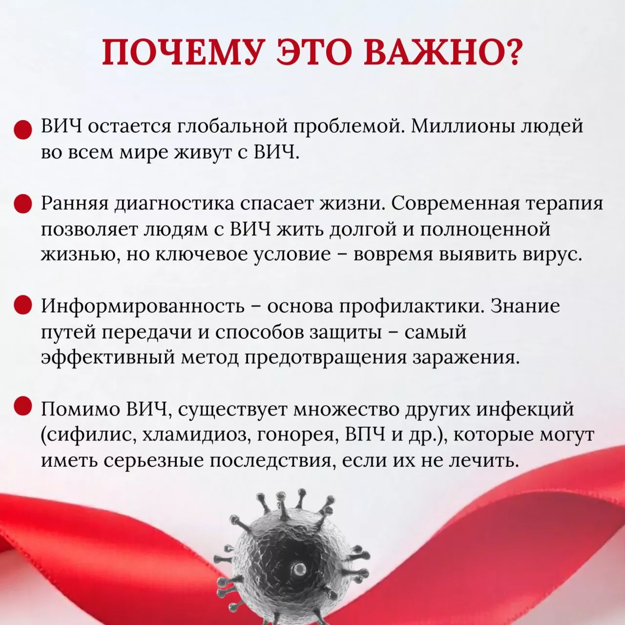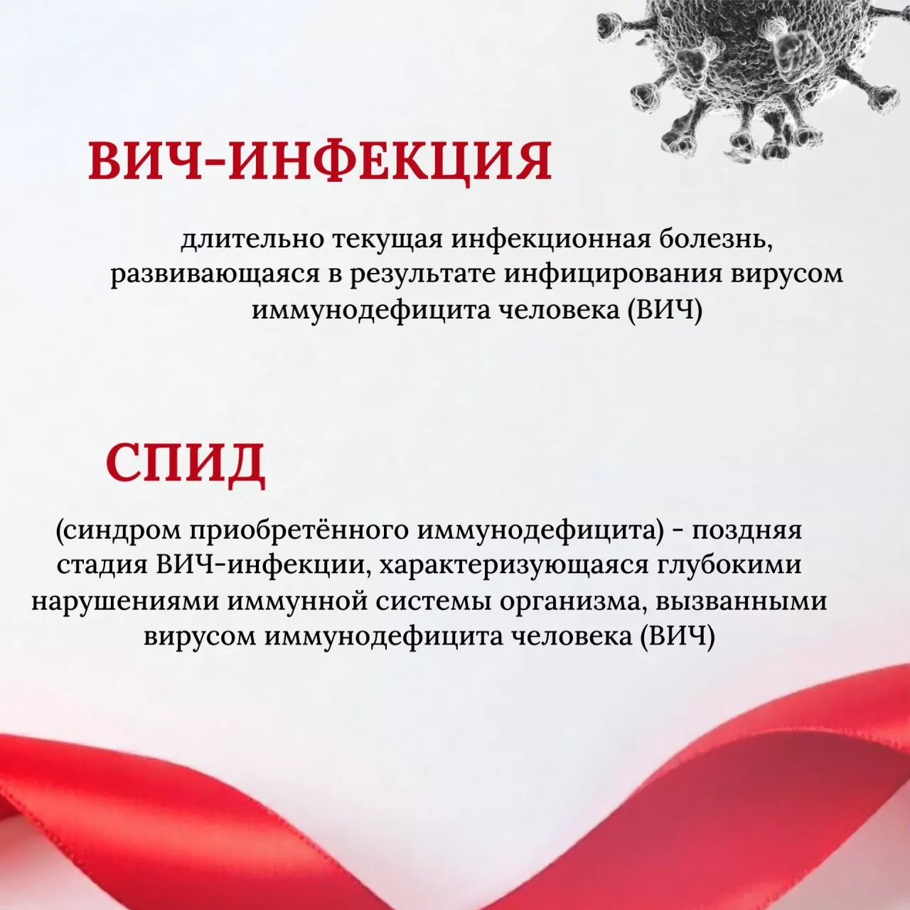 Главное, что стоит понимать: ВИЧ и СПИД — не одно и то же. ВИЧ — это вирус, который поражает иммунитет. А СПИД — это уже тяжёлая стадия болезни, когда организм не может бороться с инфекциями. Важно помнить: сегодня диагноз — не приговор. Если вовремя обнаружить вирус и начать правильное лечение, человек может жить полноценно, работать, создавать семью и не передавать инфекцию дальше.
