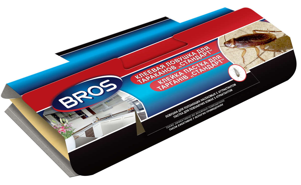 Производством клеевых ловушек от тараканов Bros занимается одноименная польская компания, использующая в своей работе как проверенные технологии, так и инновационные достижения по борьбе с нелетающими насекомыми. Конструкция устройства представляет собой домик с приманкой, который размещается в местах обитания нежелательных насекомых. Попадая внутрь ловушки, «гости» оказываются на поверхности липкой ленты, выбраться с которой невозможно. Конструкция полностью скрывает останки маленьких вредителей, поэтому допустимо использовать один домик в течение длительного времени, пока в него не угодит несколько десятков особей.