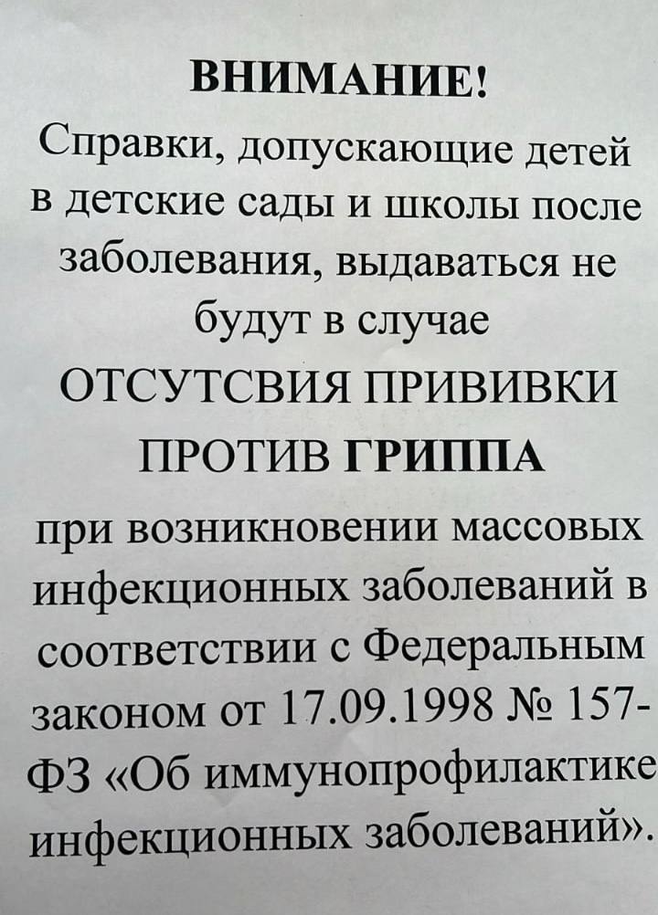 В сообщении утверждается, что ребенку, не прошедшему вакцинацию, могут не выдать справку для выхода в учебное заведение после болезни. Этот слух, активно тиражируемый с прошлого дня в анонимных телеграм-каналах, вызвал возмущение родителей. Они требуют от местной детской поликлиники официальных разъяснений, напоминая, что по закону прививка от гриппа является добровольной, а не обязательной.