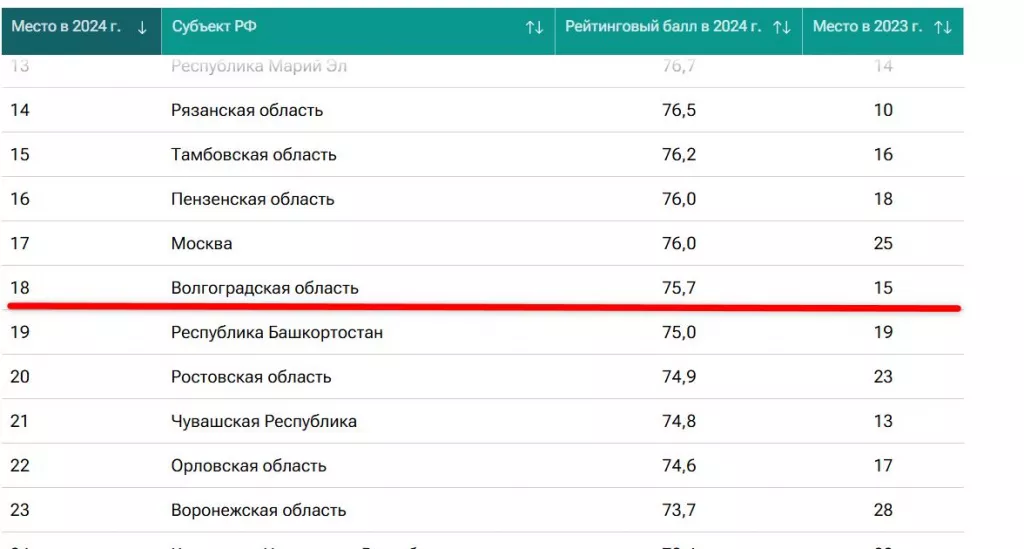 В текущем рейтинге Волгоградский регион расположился ниже Рязанской, Тамбовской и Пензенской областей. При этом Москва, напротив, совершила резкий рывок, поднявшись с 25-й на 17-ю позицию.