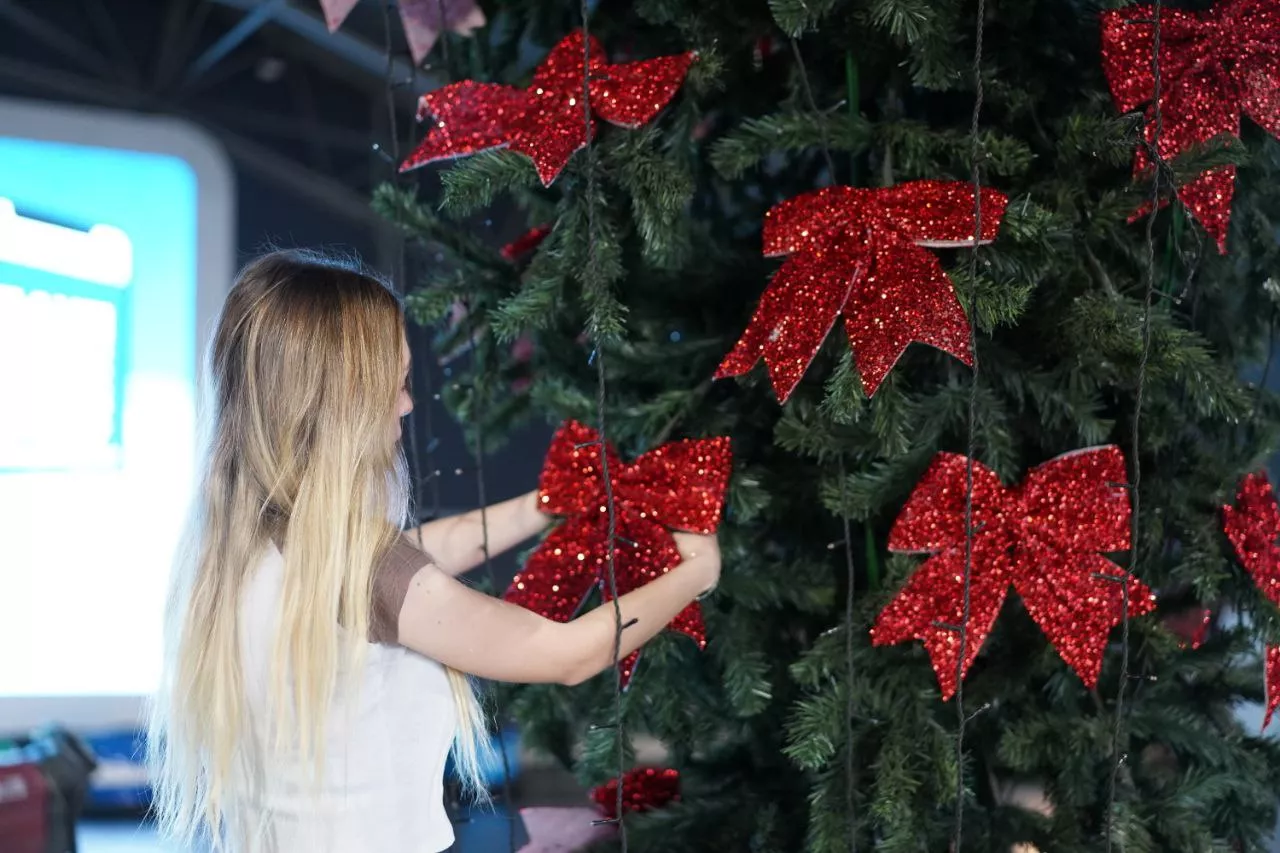 Необычная новогодняя ель, подвешенная к потолку крытого автодрома, вновь радует посетителей. Такое оригинальное решение позволило создать праздничную атмосферу, не мешая автомобильным занятиям.