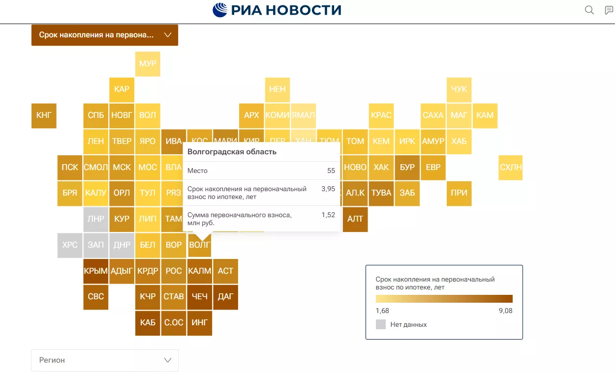 Согласно новому исследованию, жителям Волгоградской области требуется в среднем 3,95 года, чтобы собрать деньги на первоначальный взнос по ипотеке. Такой расчёт сделали аналитики центра «РИА Рейтинг», составившие общероссийский рейтинг регионов.