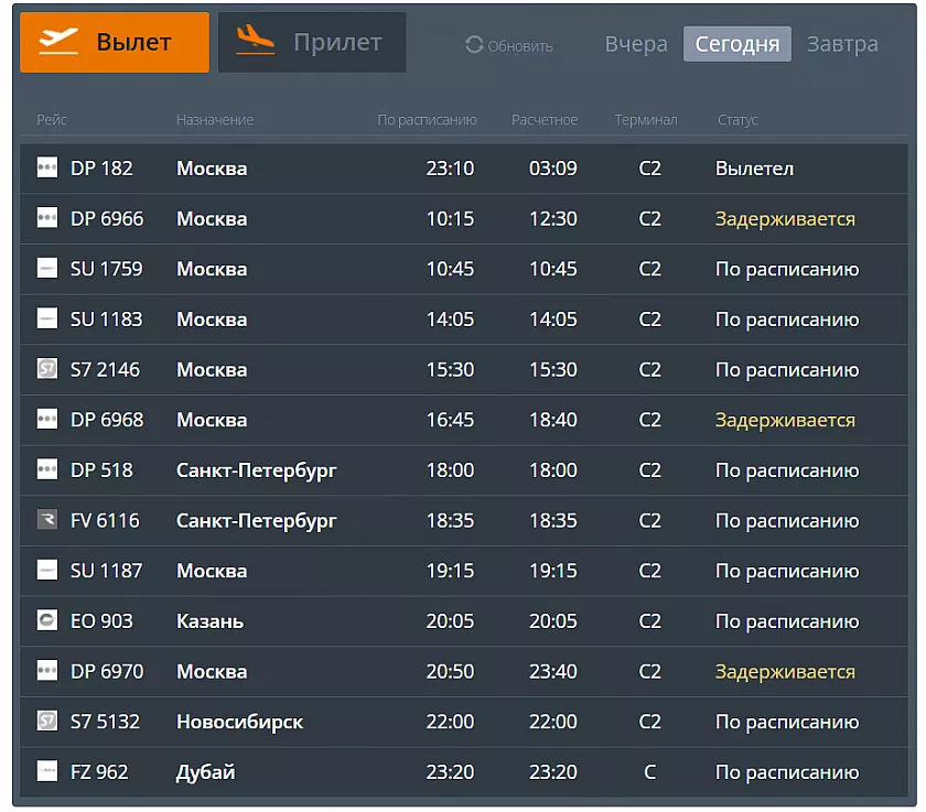 Согласно онлайн-табло, перенесено время вылета нескольких самолетов авиакомпании «Победа», которые должны были отправиться в московский аэропорт Шереметьево. Также изменилось время прилета в Волгоград трёх рейсов той же авиакомпании.